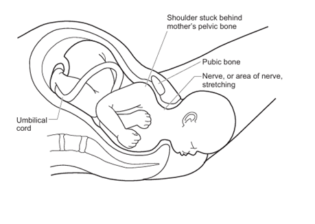 About one in ten (10%) babies who have shoulder dystocia will have some stretching of the nerves in the neck (see figure on page 1), called brachial plexus injury (BPI), which may cause loss of movement to the arm. The most common type of BPI is called Erb’s palsy. It is usually temporary and movement will return within hours or days. Permanent damage is rare.