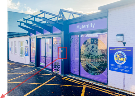The Main Entrance of the Maternity Department is closed after 6pm each evening. To access the department out of normal working hours please use the intercom, shown on the image above.